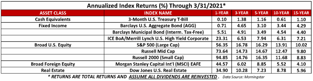 What a difference a year makes. In February of 2020, we were talking about the end of the longest bull market in history, only to move into the fastest bear market in history. The S&P 500 was down more than 20% in 21 trading days, coupled with unprecedented market volatility. There were daily swings in the S&P 500 of over 5% and weekly swings of over 10%. However, little did anyone know that the market would bottom on March 23, 2020 and come roaring back with the help of fiscal stimulus and an extremely accommodative monetary policy from the Fed, reflected in the 1-year returns. Of course, these returns are not typical and likely will not be repeated for quite some time.