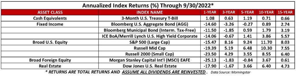 To reverse that climb, the Fed has had to raise interest rates (Fed Funds Rate) in an attempt to slow our spending. Those increases, a total of 3.0% from near zero for 2 years (March 2020-March 2022), appear to be working. In June, the Consumer Price Index peaked at 9.1%. It remains elevated but did fall to 8.2% in September. The Fed’s preferred Core Personal Consumption Expenditures Price Index of inflation excludes highly volatile food and energy prices and has been gradually decreasing to a current 4.9% in August. Housing and used car price are also slowing. Though trending down, the inflation drop will not be linear. The impact the Fed seeks in the economy from interest rate hikes unfortunately takes a lot of time (9 months to 2 years) to show up. Until the Fed sees that inflation is consistently declining and consumer demand moderates, we expect them to continue to raise rates.