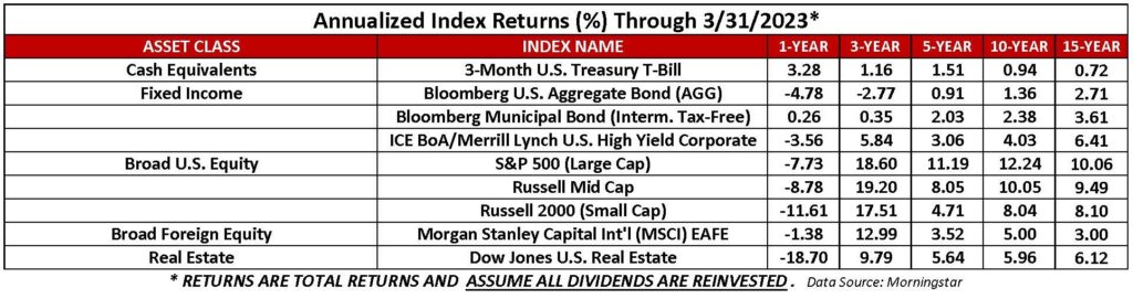 Cash & Fixed Income: High-yield corporate bonds led for the quarter and all other time periods except the 1-year, where cash was king. However, cash was the worst-performing category for the quarter, 10, and 15 years. Aggregate bonds were the laggard for the past 1, 3, and 5 years.