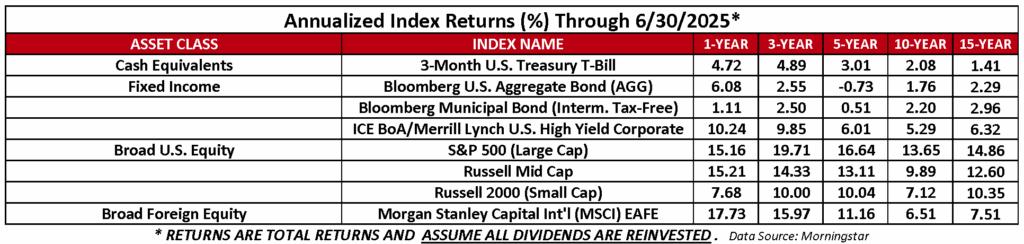 The economic picture is moving very quickly, which is why we continue to position portfolios in diversified, high-quality holdings that are built to weather economic storms as they arise. Volatility will likely pick up again as trade deals are announced, but the consumer remains resilient, and earnings remain fairly robust. As conditions change and the economic picture becomes clearer, we will adjust portfolios accordingly. As always, we welcome a conversation about anything on your mind, including your updated financial situation, goals, or risk tolerance.