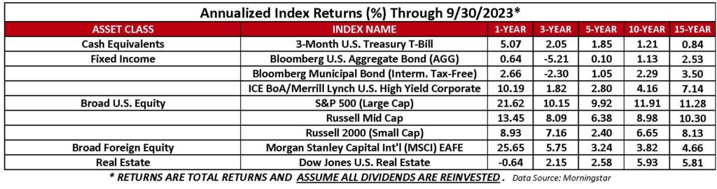 After a strong first two quarters, the market pulled back in the third quarter. The Fed’s latest ‘higher for longer’ phrase caused the markets to sell off and bond yields to rise. There was a risk-off posturing throughout the quarter and a pullback of the AI hype. If you remove the seven names that generated all of the growth in the S&P 500, the markets are actually now flat to slightly down for the year.