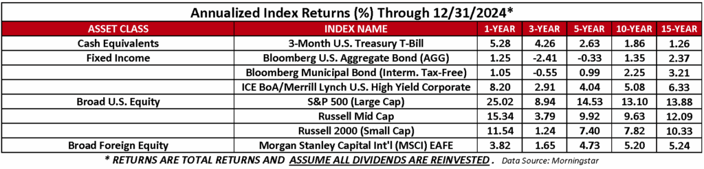 U.S. equity markets had another strong year, even though equity markets sold off about 10% from mid-July through mid-August and drifted lower in the second half of December. The Fed cut rates again in December but signaled fewer cuts in 2025 based on positive economic data and sticky inflation, which contributed to negative bond returns in the fourth quarter and the catalyst to the selloff in mid-December. The potential for additional tariffs caused foreign stock to sell off significantly throughout the quarter.