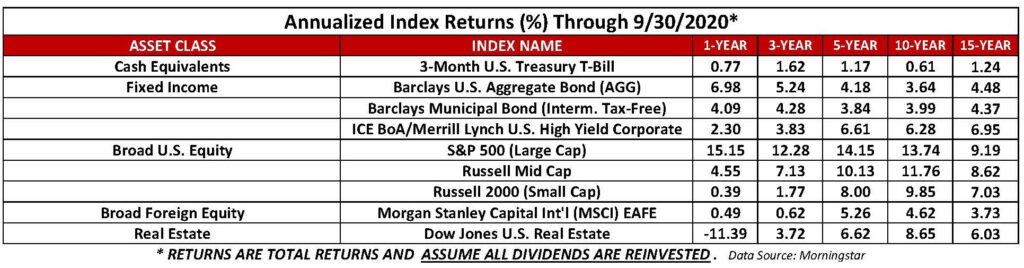 The economic recovery continued throughout the quarter. U.S. manufacturing expanded for a 5th straight month ending September. Consumer spending climbed for a 4th consecutive month ending August. The unemployment rate dropped to 7.9% through September. It has gradually ticked down since peaking at 14.7% in April. Keep in mind the rate was 3.5% at the beginning of the year, a 50-year low.